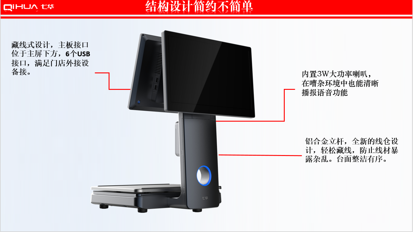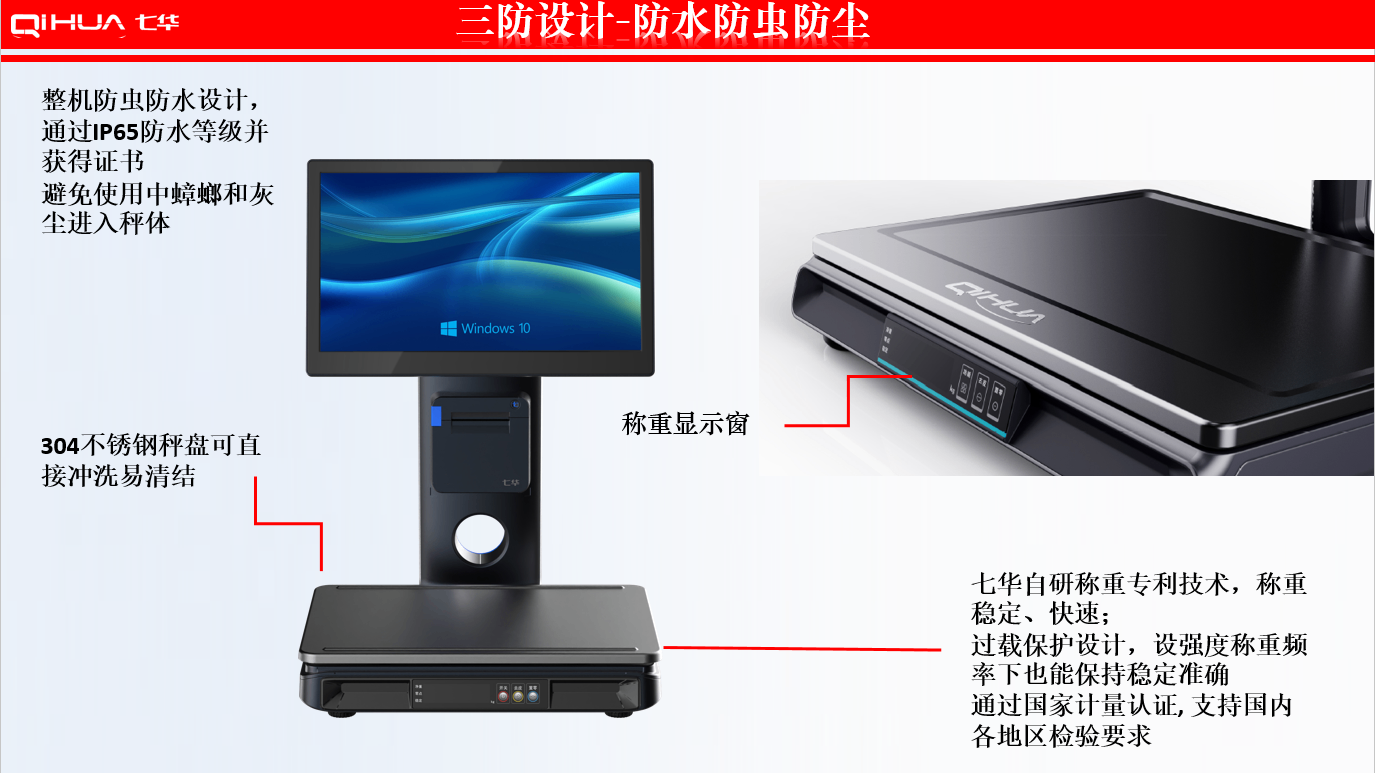描述:新一代創(chuàng)新設(shè)計(jì),雙15.6英寸大屏,多點(diǎn)式電容觸摸屏可(0~50可調(diào)節(jié)角度)。鋁合金立桿,全新的線倉設(shè)計(jì),輕松藏線,防止線材暴露雜亂。臺面整潔有序。七華自研稱重專利技術(shù),稱重穩(wěn)定、快速;過載保護(hù)設(shè)計(jì),設(shè)強(qiáng)度稱重頻率下也能保持穩(wěn)定準(zhǔn)確;通過國家計(jì)量認(rèn)證, 支持國內(nèi)各地區(qū)檢驗(yàn)要求。外觀無死角設(shè)計(jì),方便日常維修清潔。 防水防蟲設(shè)計(jì),輕松應(yīng)該對農(nóng)貿(mào)市場等惡劣環(huán)境。